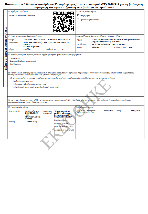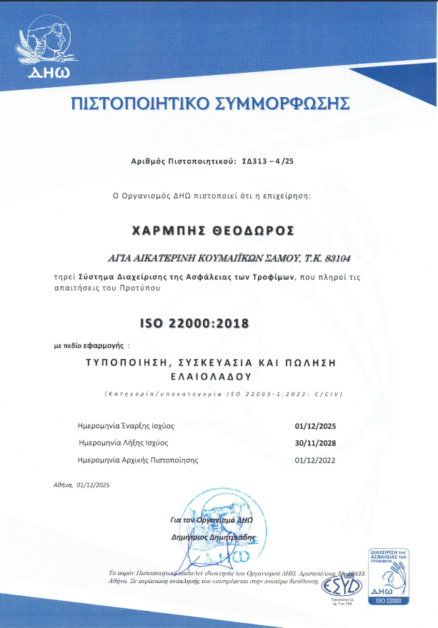 Στόχος μας είναι η προστασία του περιβάλλοντος και η διασφάλιση της ποιότητας και της υγιεινής του ελαιόλαδου. Για το λόγο αυτό πιστοποιήσαμε όλη τη διαδικασία παραγωγής από τον ελαιώνα μέχρι την τελική συσκευασία.